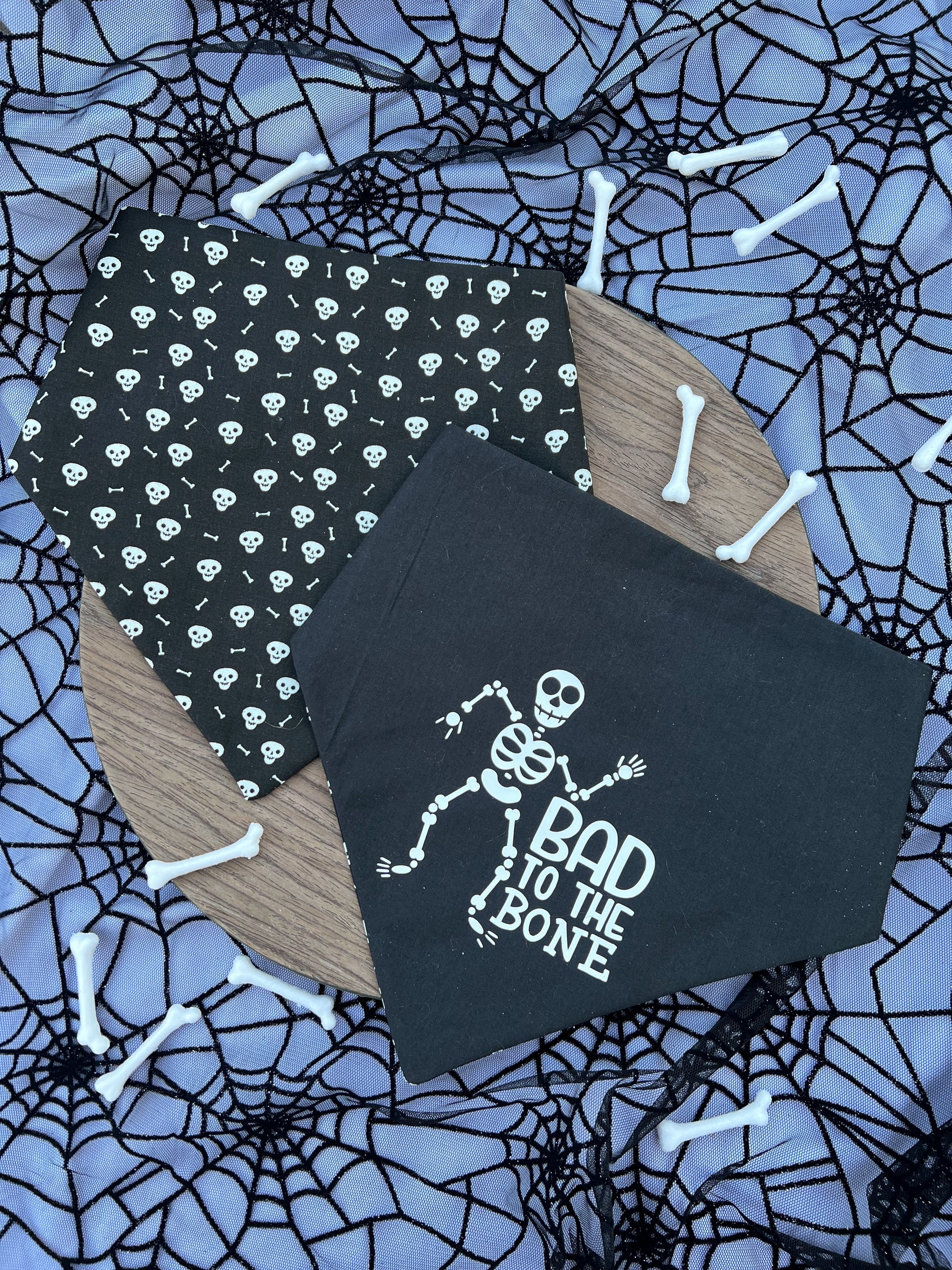 An animal bandana that is black with skulls and the reversible side is all black with a skeleton that says “bad to the bone