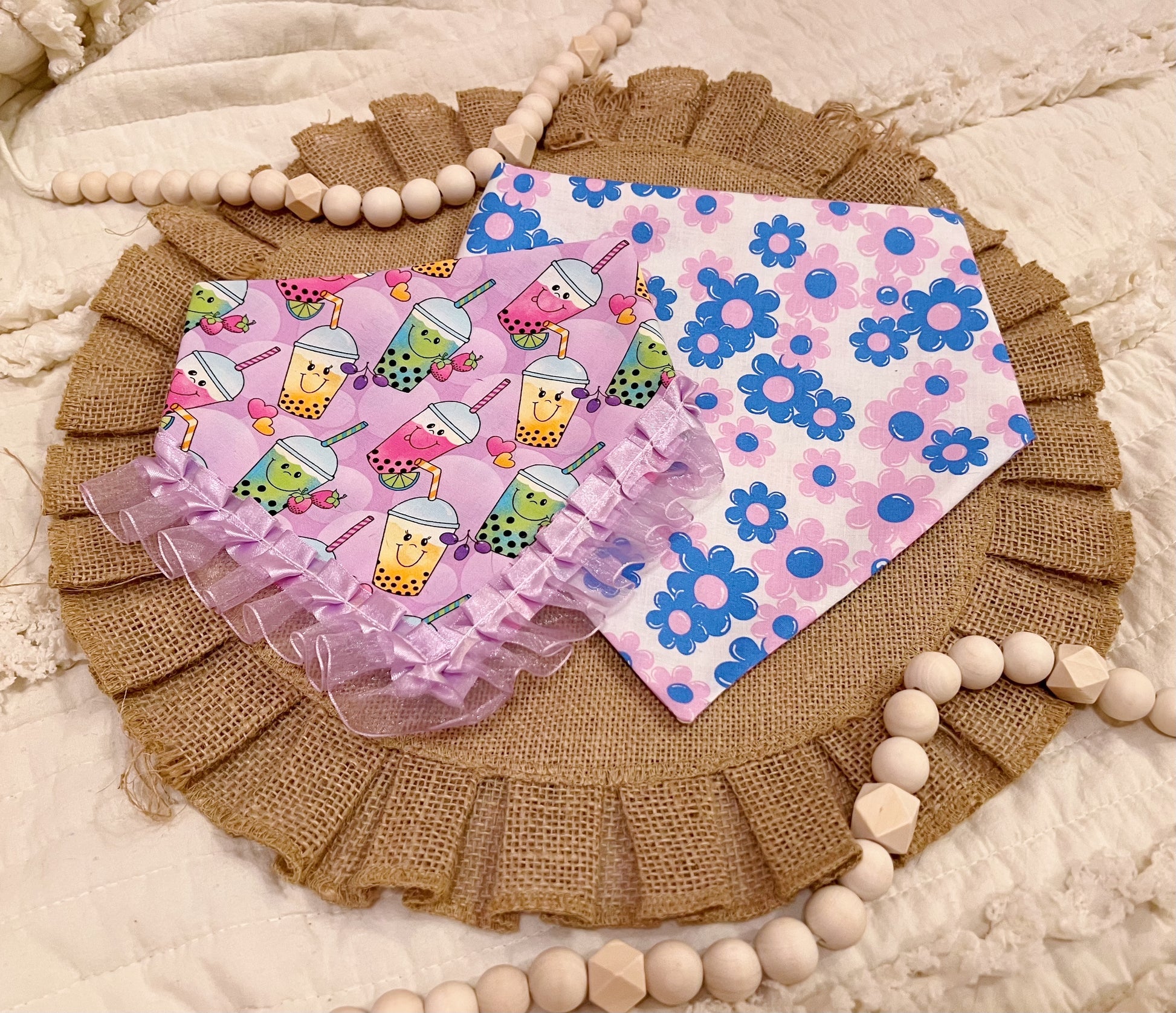 An animal bandanna that is reversible one side is purple purple with colorful Boba on it. The other side is a white background with lavender and blue bubble flowers. Choice of trim.