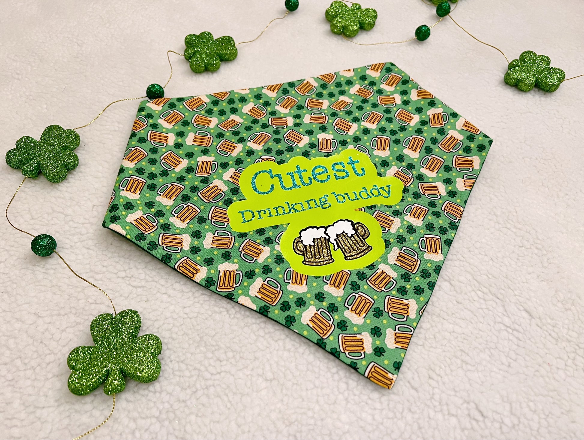 An animal bandana that is green with beer bugs all over it and a vinyl decal saying “Cutest Drinking Buddy”