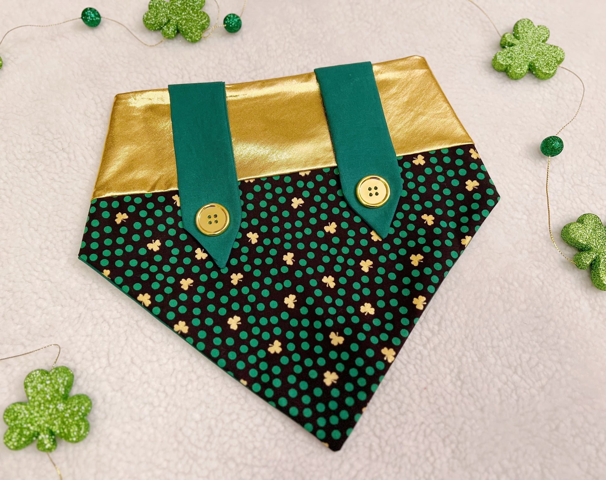 An animal bandana that is overall styled with the shirt part as a bright hood and the pants as a black fabric with green polka dots and Gold shamrocks, with green straps and gold buttons.