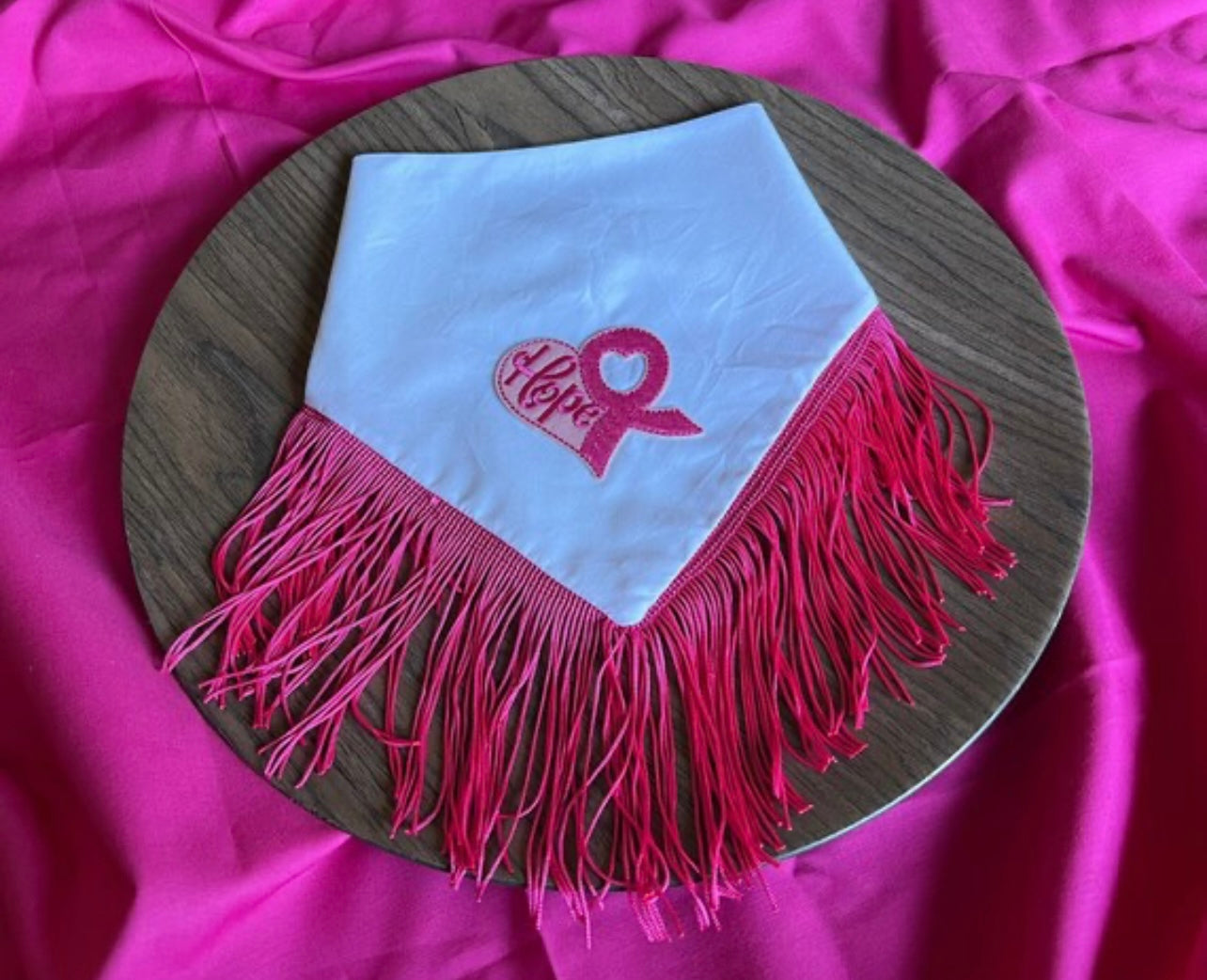 An animal bandanna that is white with a choice of no trim or a long fringe pink trim and the bandanna had a breast cancer patch that says “hope”