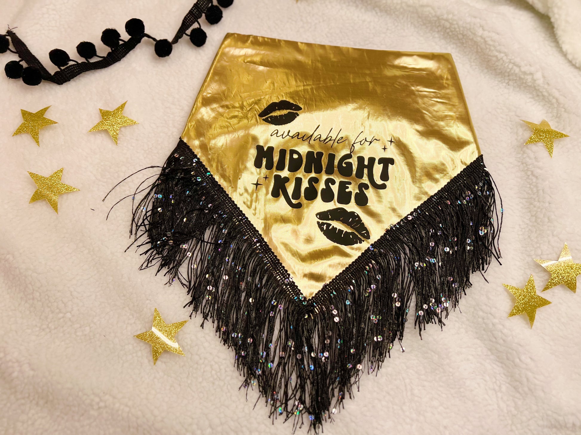 An animal bandana that is a shiny gold fabric with a vinyl add on “available for midnight kisses”