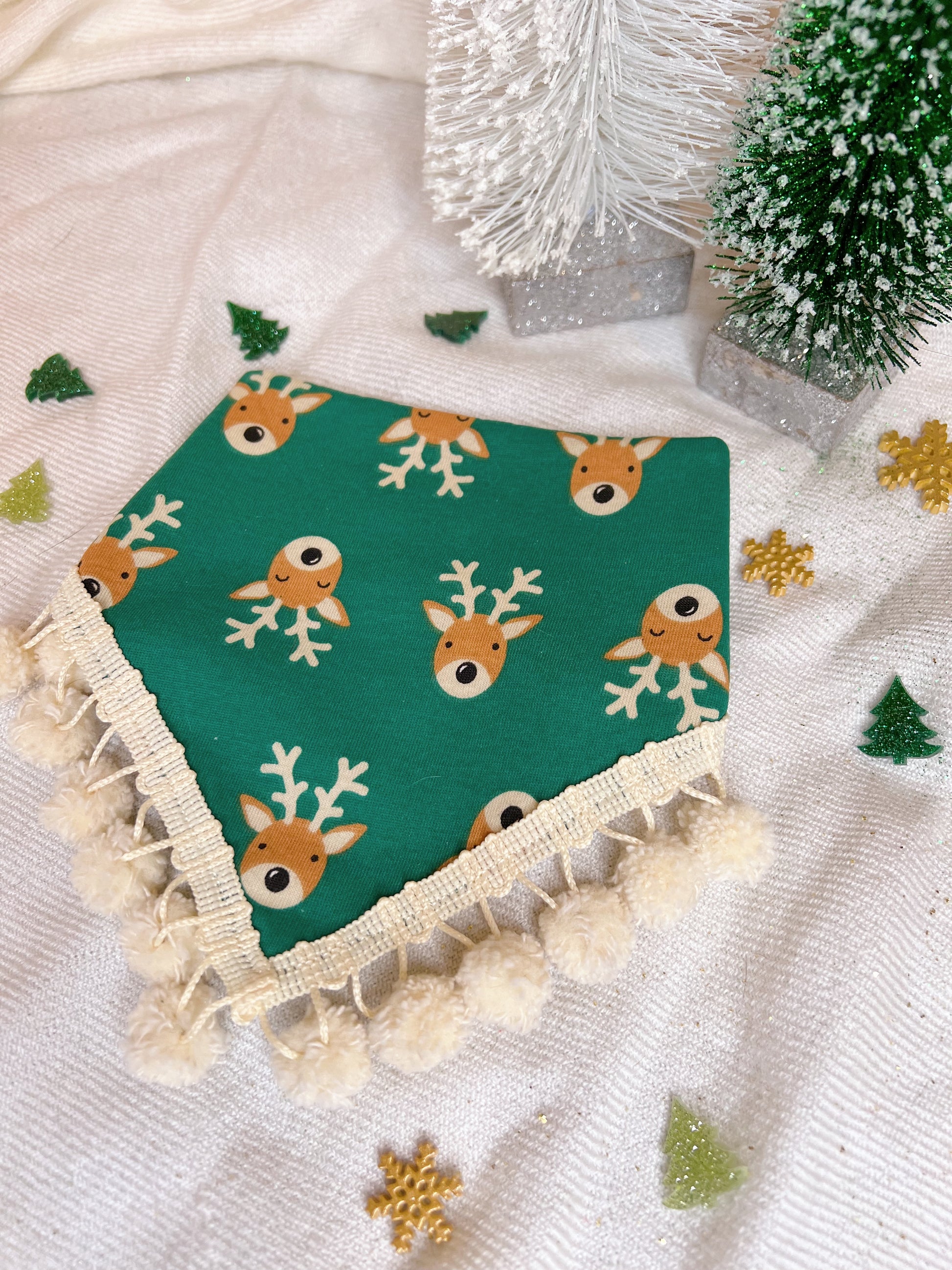 A pet bandana that is green with cute deer on it and choice of no trim or a cream colored pom trim
