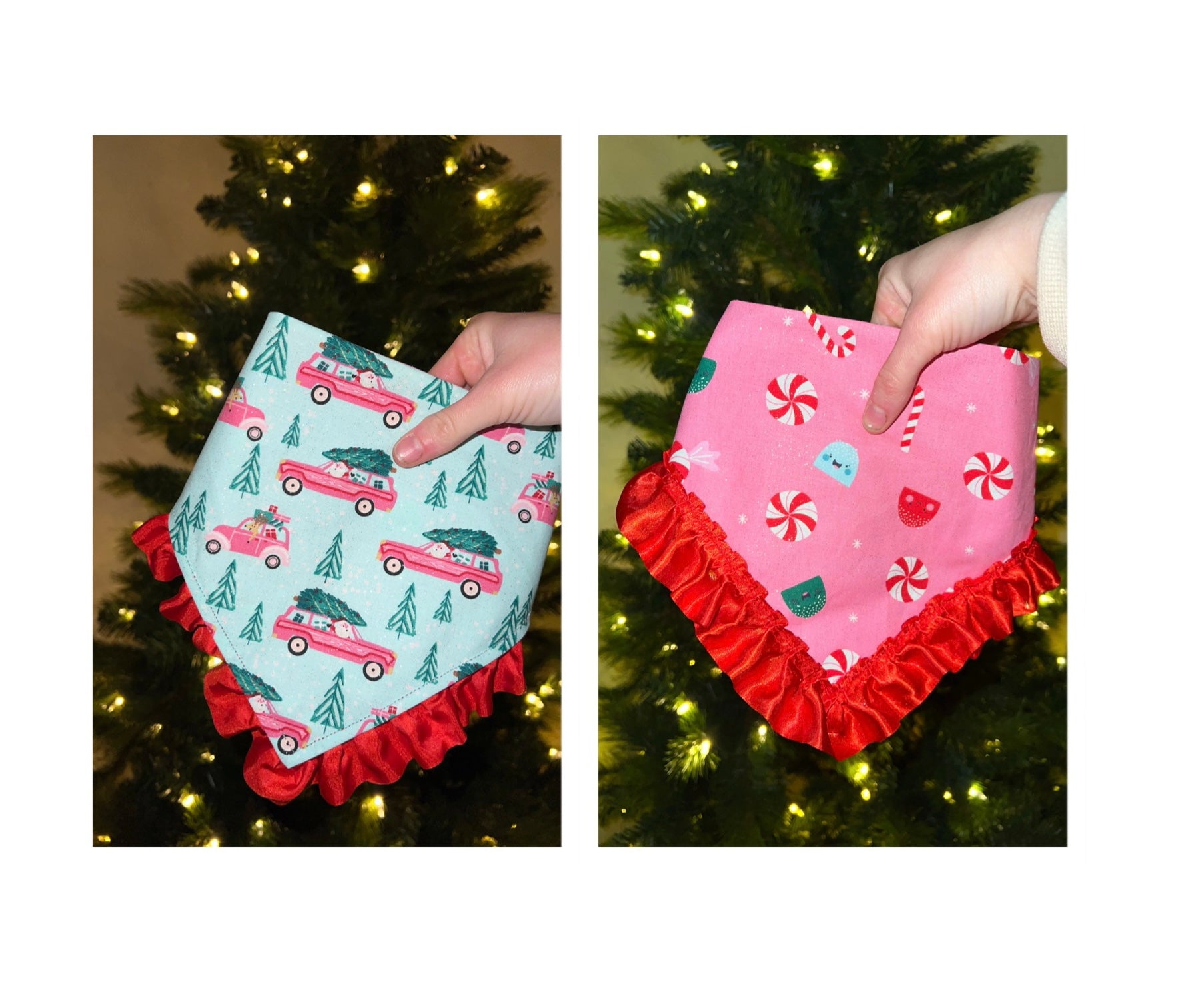 A pink Christmas bandana that is double sided one side is teal with Santa driving card and the other side is mints and gum drops with red trim