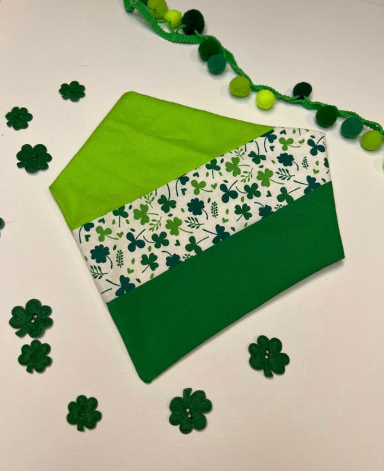 In the animal bandanna that is a three-way with a shamrock fabric in the middle and a dark green on one side and light green on the other
